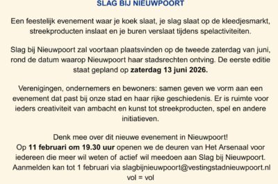 Een gloednieuw, feestelijk evenement in Nieuwpoort, waar je koek slaat, je slag slaat op de kleedjesmarkt, streekproducten inslaat en je buren verslaat tijdens spelactiviteiten. Slag bij Nieuwpoort zal voortaan plaatsvinden op de tweede zaterdag van…