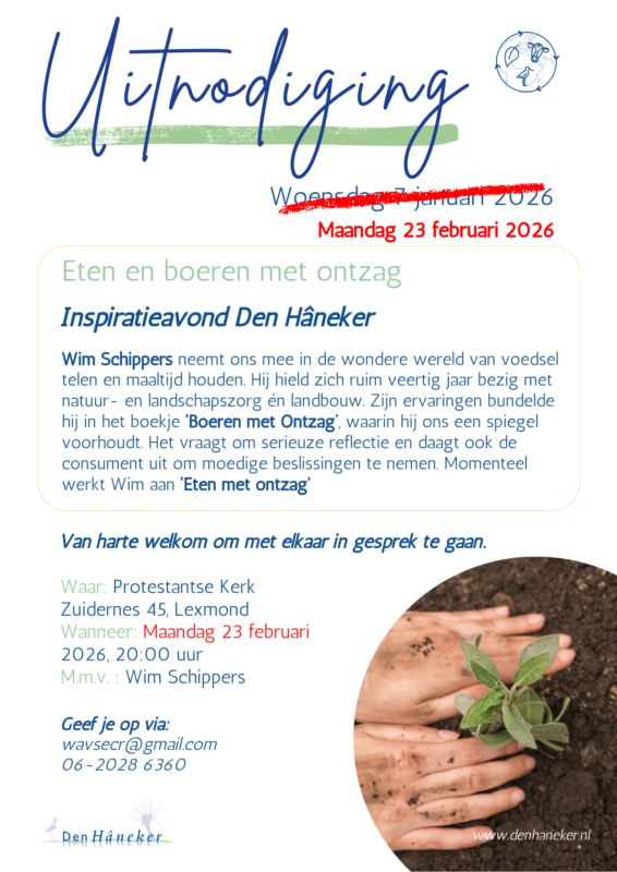 Vanwege het winterse weer is de inspiratieavond ‘Eten en boeren met ontzag’ van Den Hâneker verplaatst van woensdag 7 januari 2026 naar maandag 23 februari 2026.