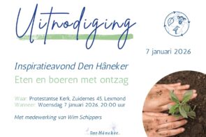 Avond voor boeren en burgers, over duurzaamheid en geloof: 7 januari Afgelopen Wereldvoedseldag, in oktober, organiseerde de werkgroep duurzame landbouw (WAV) van Den Hâneker, boerencoöperatie,…