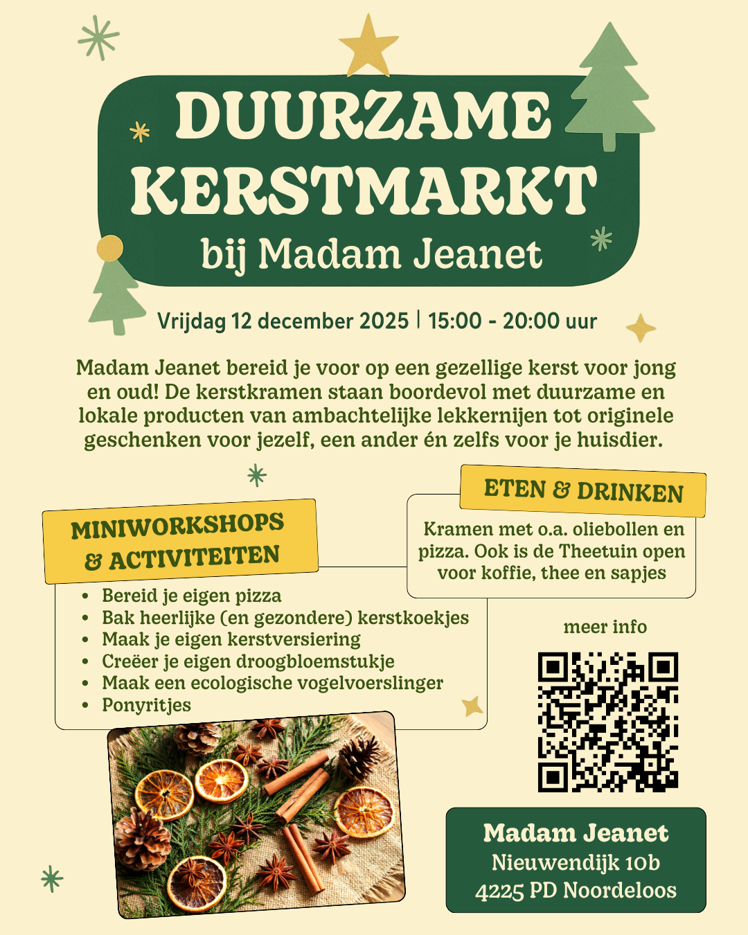 Vrijdag 12 december | Duurzame Kerstmarkt bij Madam Jeanet 27 november 2025 Meer info: Kerstmarkt Madam Jeanet Facebook Twitter Pinterest LinkedIn E-mail Gerelateerde berichten Liniebureau plaatst 40 nieuwe waterlinieborden in Groene Hart Het bord aan de Kruipin in Woerden is net geplaatst WOERDEN, 15-8-2025 Het Liniebureau in… Stichting Boerderij en Erf | Nieuwsbrief Boer & Hoeve Klik hier om de nieuwsbrief van Stichting Boerderij & Erf te lezen met hierin de volgende… Het Kontakt | Bijeenkomst in Noordeloos over zorgvuldig omgaan met de aarde | Wereldvoedseldag Noordeloos - Op donderdag 16 oktober organiseren Den Hâneker en de werkgroep duurzame landbouw en…